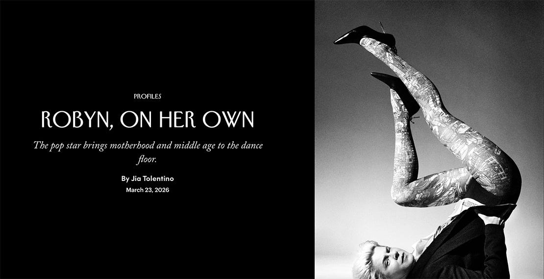 Did you see the Jia Tolentino article about Robyn in the New Yorker this week!? I had to tell my family that I would be unavailable for the next 30 mins while I read the article with my coffee. What a delight, I highly recommend it! Jia Tolentino is one of my favorite culture writers. She is so smart and hilarious and I always learns so much from her writing. Here book of essays, Trick Mirror: Reflections on Self-Delusion, is totally brilliant and made me LOL and think deeply about things like “The I in the Internet” and “The Cult of the Difficult Woman.”